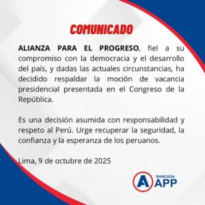 El partido de César Acuña también le dio la espalda a Dina Boluarte. “Alianza Para el Progreso, fiel a su compromiso con la democracia y el desarrollo del país, y dadas las actuales circunstancias, ha decidido respaldar la moción de vacancia presidencial presentada en el Congreso de la República”, señala un escueto comunicado.