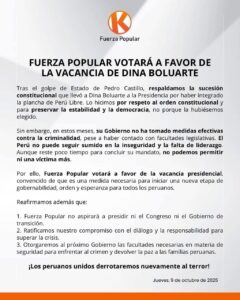 Mediante un comunicado, el partido liderado por Keiko Fujimori fue el primero en anunciar su apoyo a las mociones de vacancia presidencial. “El Perú no puede seguir sumido en la inseguridad y la falta de liderazgo. Aunque reste poco tiempo para concluir su mandato, no podemos permitir ni una víctima más”, se lee en el documento.