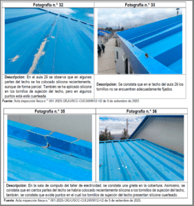 Adicionalmente, la Contraloría documentó deficiencias constructivas en la infraestructura de contingencia ya recibida. Pese a haberse suscrito actas sin observaciones, se detectaron tableros eléctricos sin identificación adecuada de dispositivos, espacios de reserva sin protección, filtraciones en techos y canaletas en proceso de desprendimiento. Estas irregularidades comprometen la calidad, durabilidad y funcionamiento seguro de las instalaciones temporales que actualmente albergan estudiantes.