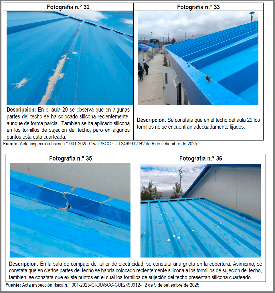 Adicionalmente, la Contraloría documentó deficiencias constructivas en la infraestructura de contingencia ya recibida. Pese a haberse suscrito actas sin observaciones, se detectaron tableros eléctricos sin identificación adecuada de dispositivos, espacios de reserva sin protección, filtraciones en techos y canaletas en proceso de desprendimiento. Estas irregularidades comprometen la calidad, durabilidad y funcionamiento seguro de las instalaciones temporales que actualmente albergan estudiantes.