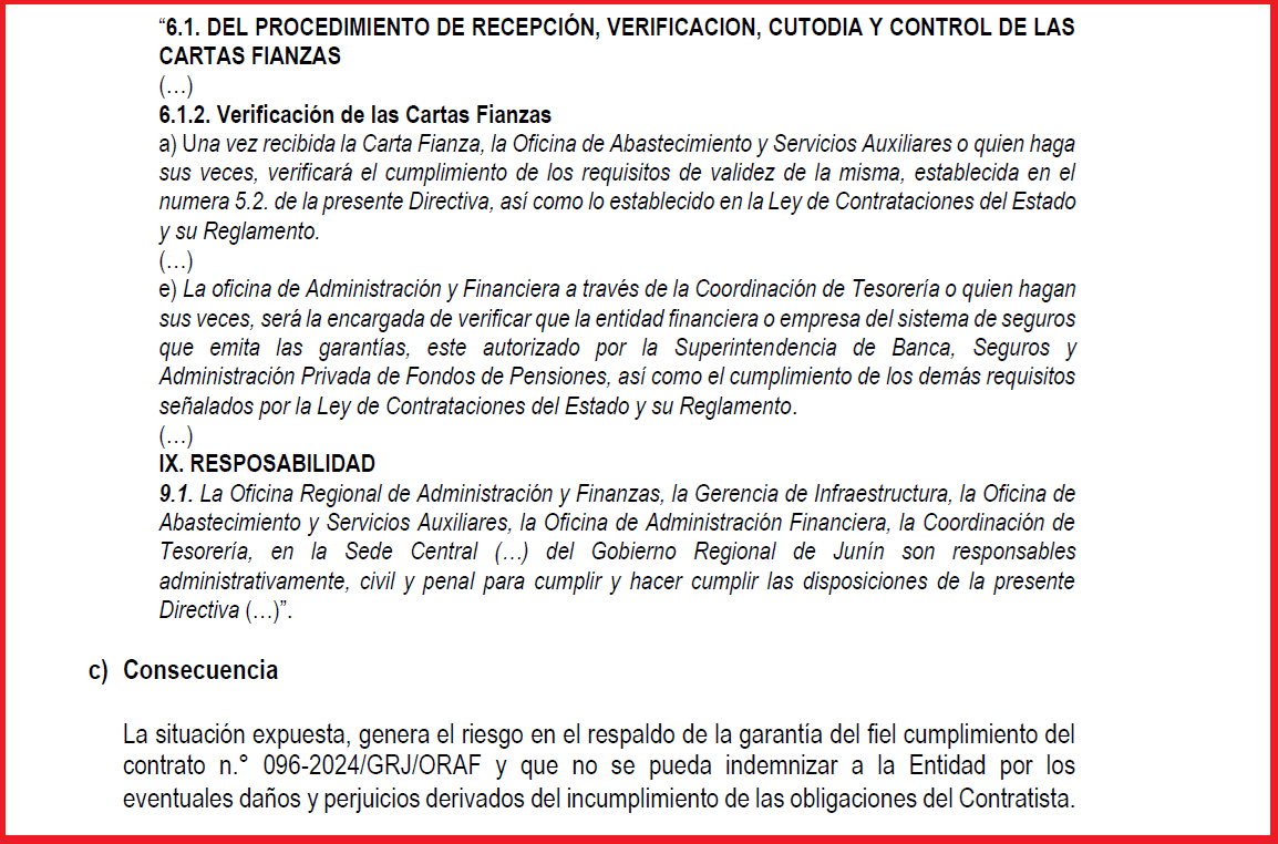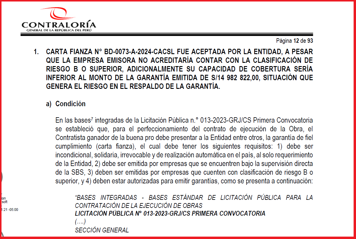 Tal como lo reveló Infoandes.pe, la Contraloría General de la República identificó graves irregularidades en la ejecución de la construcción de la nueva infraestructura del colegio Politécnico Regional del Centro de El Tambo, en Huancayo. El hallazgo más resaltante revela que el Gobierno Regional de Junín (GRJ) aceptó una carta fianza de S/ 14.9 millones como garantía de fiel cumplimiento, pese a que la entidad emisora carece de clasificación de riesgo exigida y su capacidad de cobertura es inferior al monto garantizado.