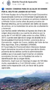 Para la Fiscalía Provincial Corporativa Especializada Contra la Criminalidad Organizada de Ayacucho, el dinero provenía de los delitos contra la administración pública que el acusado logró insertar al sistema económico formal, con la finalidad de evitar la identificación de su origen ilícito.