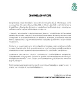 Por su parte, la empresa Operadores Concentrados Peruanos SAC lamentó el fallecimiento de los trabajadores. “Se encuentra en curso la investigación orientada a esclarecer las causas y circunstancias de lo ocurrido”, se lee un comunicado publicado en sus redes sociales.