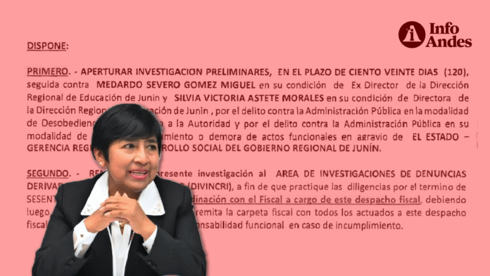 La disposición fiscal, a cargo de la magistrada Katy Zarate Araujo, también comprende al exdirector regional Medardo Severo Gómez Miguel, por la presunta comisión de los delitos de desobediencia y resistencia a la autoridad, así como omisión, rehusamiento o demora de actos funcionales en agravio del Estado. Según los antecedentes, el Ministerio de Educación (MINEDU) y el Gobierno Regional de Junín (GRJ) ordenaron la nulidad de dichos documentos tras acreditarse pericialmente la falsificación de firmas en los títulos inscritos irregularmente.