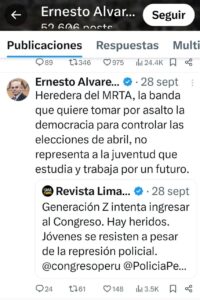 Ernesto Álvarez, un personaje muy cuestionado, defendió la Ley Nº 32108 sobre el crimen organizado que beneficia a las redes criminales. En su cuenta de X calificó a la movilización de mañana 15 de octubre como “intento subversivo” para acabar con la democracia y forzar una asamblea constituyente “bolivariana”. Y acusó a la generación de “herederos de la MRTA” y al paro de los choferes de “transportistas radicalizados”.