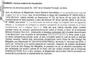 Según la apertura de investigación, el juez Santana Socualaya habría ordenado el desalojo contraviniendo al artículo 49 de la Ley 30680 que declara la zona de riesgo no mitigable exenta de acciones judiciales en el fuero constitucional, civil o cualquier otro.