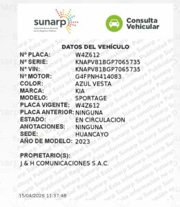 De acuerdo a la consulta vehicular de SUNARP, la unidad móvil W4Z-612 pertenece a la empresa J & H COMUNICACIONES S.A.C., firma en la que Yauri Salomé figura como Gerente General según registros de la SUNAT desde el año 2021. El vehículo, una Kia modelo Sportage del año 2023 en color azul vesta, fue el escenario de la detención luego de que el implicado realizara maniobras temerarias que alertaron a los efectivos de la comisaría del sector.