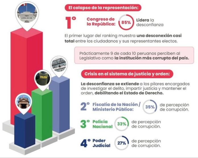 De acuerdo con la Encuesta Nacional sobre Percepciones de la Corrupción 2025, la corrupción impacta la vida del 87 % de la ciudadanía y el Congreso es percibido como la institución más corrupta (85 %).