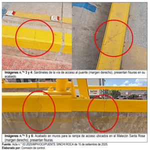 Según el informe de control N° 061-2025, los sardineles de las vías de acceso tanto del Malecón Santa Rosa y Virgen de la Candelaria, y los muros para la rampa presentan fisuras en su acabado. La vereda también registra una fisura en toda su longitud, lo que expone a un pronto deterioro de la obra.