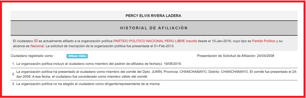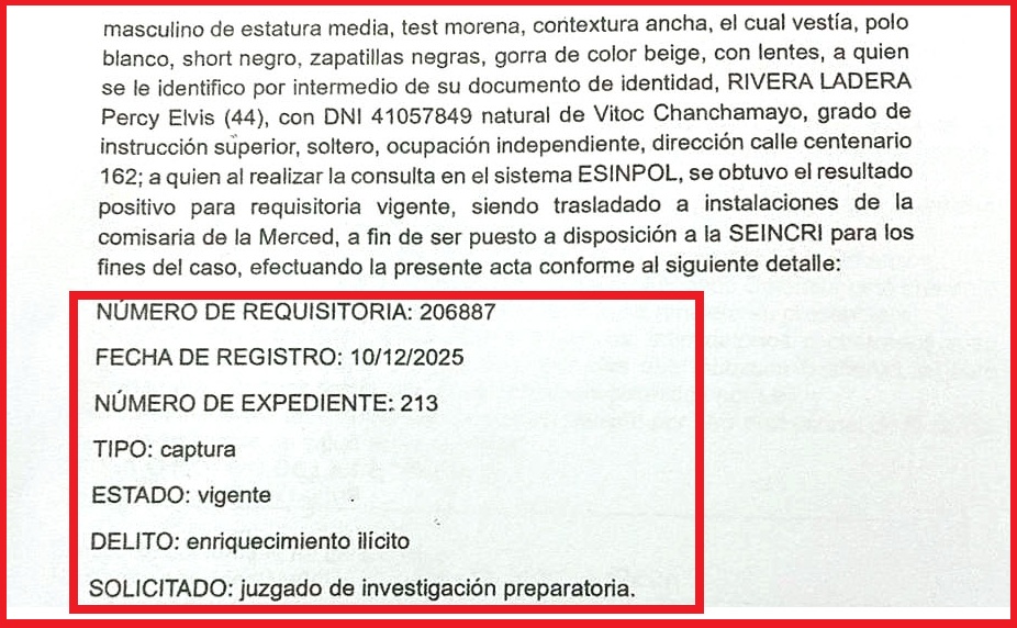 El militante de Perú Libre fue detenido a las 13:40 horas de ayer por la policía de Chanchamayo, dentro de las instalaciones del billar «Masterbets 365», en inmediaciones de la plaza principal de La Merced. Rivera Ladera, quien vestía polo blanco, short negro, zapatillas negras, gorra de color beige y usaba anteojos, mantenía requisitoria vigente N° 206887, dictada el 10 de diciembre de 2025 en el expediente N° 213, por lo que fue trasladado a la comisaria.