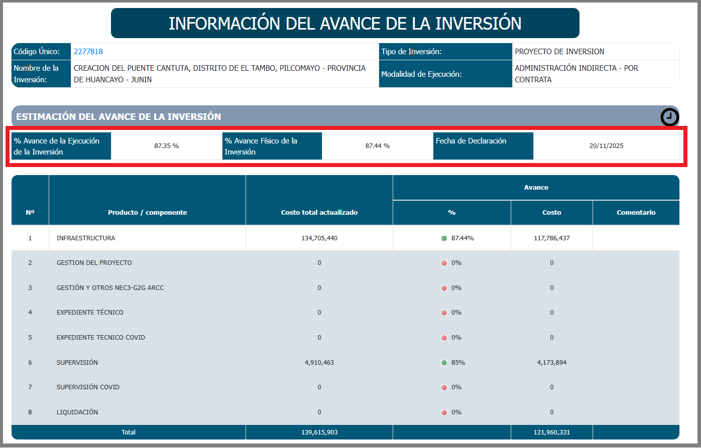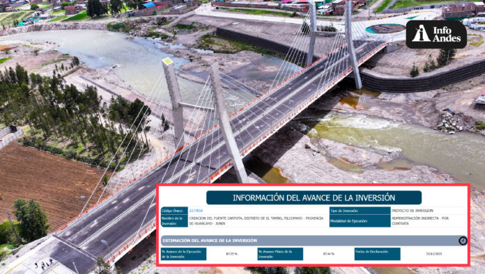 Pese a que el Gobierno Regional de Junín (GRJ) anunció la inauguración del puente La Cantuta, que unirá los distritos de Pilcomayo con El Tambo, para este 12 de diciembre, el portal del Sistema de Seguimiento de Inversiones del Ministerio de Economía y Finanzas (MEF) registra un avance de ejecución física de solo 87% en esta obra ejecutada por la empresa SIMA Perú.