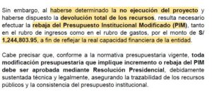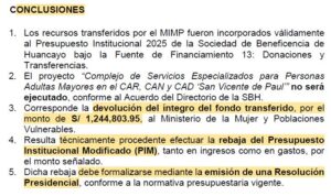 De acuerdo al informe técnico N°05-2025 del 22 de diciembre, la SBH devolvió 1 millón 244 mil 803.95 soles, monto que fue transferido el 7 de marzo de 2025 mediante Resolución Ministerial N° 086-2025-MIMP y se incorporó al presupuesto institucional de la entidad el 1 de abril.