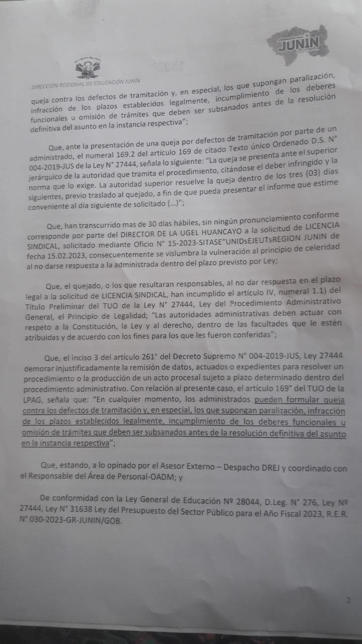 La Resolución detalla que el director de la Ugel Huancayo, no dio respuesta ni pronunciamiento habiendo transcurrido más de 30 días hábiles a la solicitud de licencia sindical, por lo que el titular de la UGEL habría incumplido lo dispuesto en la Ley N° 27444, Ley de Procedimiento Administrativo General en lo referido al principio de celeridad y a los deberes funcionales y omisión de trámites.