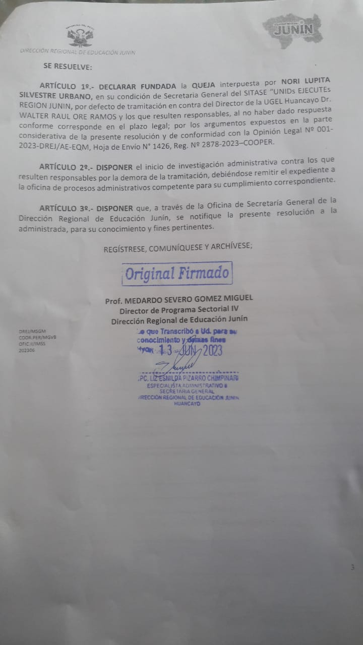 En el documento, también declara fundada la queja por defecto de tramitación interpuesta por Nori Lupita Silvestre Urbano, secretaria general del SITASE «Unids Ejecutes Región Junín», en contra del director de la UGEL Huancayo Walter Raúl Oré Ramos y los que resulten responsables, al no haber dado respuesta, dentro del plazo legal, a las imputaciones en su contra por parte de la dirigente sindical.