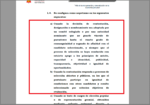La fórmula legal propone añadir el numeral 1.4 al Artículo 1 de la Ley 26771, supuestos clave como que no se configura nepotismo si la decisión de designación o contratación es adoptada por un comité colegiado o una autoridad que “no guarde vínculo de parentesco” hasta el cuarto grado de consanguinidad y segundo de afinidad con el candidato seleccionado, o cuando el proceso “es público y basado en el mérito, la capacidad y la transparencia”.