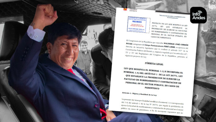 El congresista Waldemar José Cerrón Rojas presentó un proyecto que busca modificar la Ley de Nepotismo (Ley N° 26771), que prohíbe el nombramiento y contratación de personal en el sector público en casos de parentesco. La iniciativa de Perú Libre busca incorporar supuestos que, a criterio del legislador, no constituyen actos de nepotismo para parientes que ya laboren en la misma entidad o empresa del Estado.