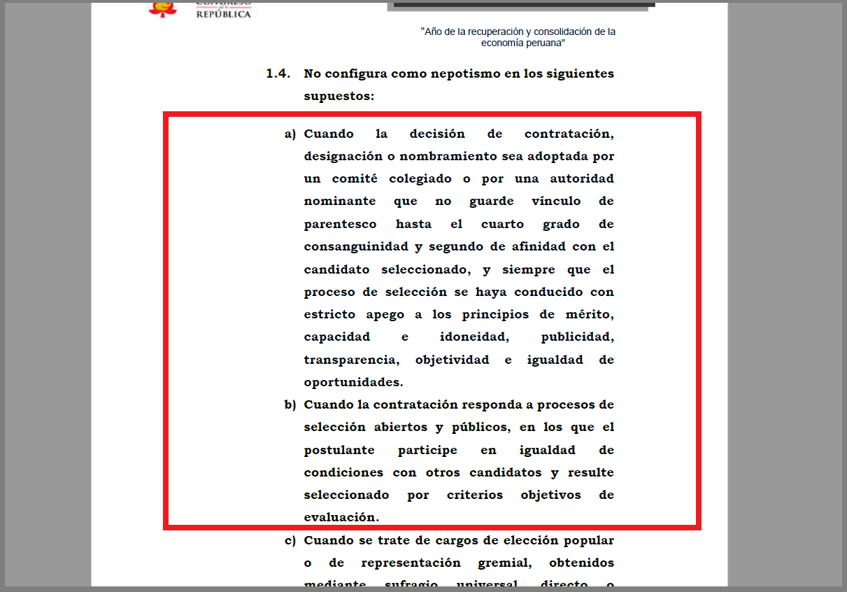 La fórmula legal propone añadir el numeral 1.4 al Artículo 1 de la Ley 26771, supuestos clave como que no se configura nepotismo si la decisión de designación o contratación es adoptada por un comité colegiado o una autoridad que “no guarde vínculo de parentesco” hasta el cuarto grado de consanguinidad y segundo de afinidad con el candidato seleccionado, o cuando el proceso “es público y basado en el mérito, la capacidad y la transparencia”.